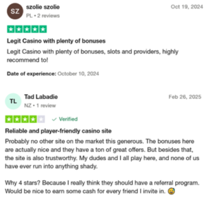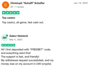 “Sehr coole Seite mit einer Vielzahl von Spielen, Sofortabhebungen ohne Provision, regelmäßig gute Boni. Es ist also alles gut, aber ich würde gerne Geburtstagsboni sehen (wie auf anderen Seiten für treue Spieler wie mich). Ich empfehle trotzdem, es zu versuchen.”