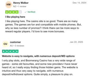Die Spieleabteilung ist sogar noch besser, mit Tausenden von Titeln von Top-Anbietern. Demo-Spiele sind sogar für nicht registrierte Spieler verfügbar. Hier sind die Spielerbewertungen für die Casinos Neon54 und Boomerang: